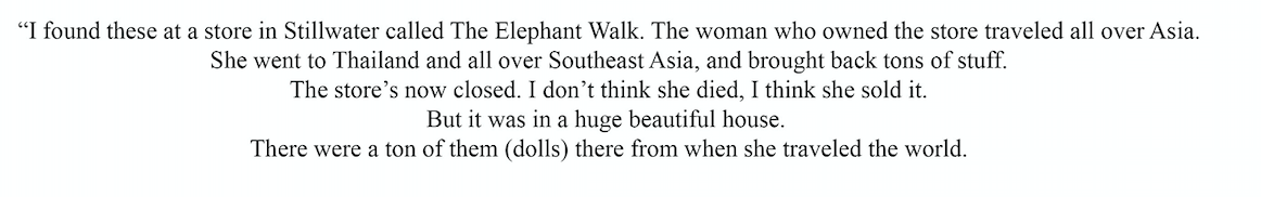 This series attempts to change conversations around antiques as “dusty”, and “decaying” object by contextualizing them and their past lives. The photos and text emphasize the mystery of these objects, as some of their stories may be more lost or displaced than others. From the antique store Hunt and Gather in Minneapolis, MN, I conducted a number of interviews with the employees at the store, asking questions about where the objects were found, what they were, who owned them previously, even their personal reaction to the object itself. It was interesting to see the way in which each employee added their own personalities to the stories of the antiques, making the history of the object not only a story of the past, but the present as well. The photographs and text reveal the way that looking into the past stories of antiques is also a way of looking into the past stories of ourselves as humans.